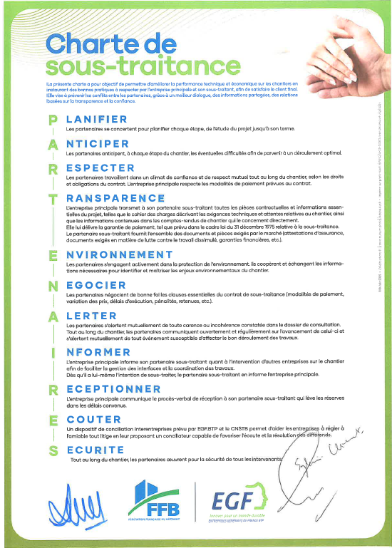 Calquée sur le modèle national, cette charte vise à améliorer la performance technique et économique des chantiers en instaurant des bonnes pratiques entre entreprise principale et sous-traitant, au bénéfice du client final.